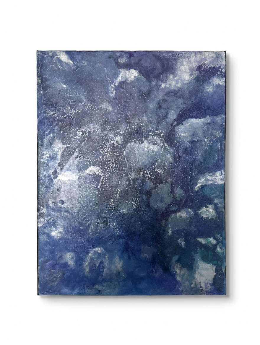 Created using the fluid acrylic pouring technique, each movement of paint produces intricate cells, textures, and flowing patterns that can never be duplicated. The layered blues and whites create depth and motion across the canvas, giving the artwork a dynamic sense of movement that changes subtly depending on lighting and viewing angle.